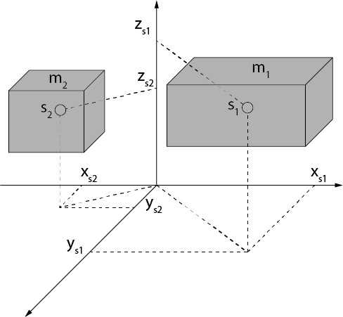 - (xs1, ys1, zs1) - tyngdpunktskoordinater för partiell kropp 1 i det spatialt fixerade koordinatsystemet (x, y, z)