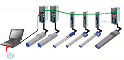 RS-serien möjliggör enkel fleraxlig bearbetning genom att kedjekoppla flera styrenheter. Parametrarna för styrenheterna från flera datorer kan bearbetas på en dator genom att helt enkelt växla mellan stationsadresserna på RS Manager-skärmen. En anslutning kan upprättas med upp till 16 styrenheter.
