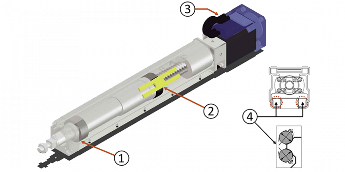 Exempel för modell RSDG1 med tvärsnittsskiss: (1) belagd kontaktskrapa – förhindrar att främmande partiklar kommer in i höljet, (2) smörjsystem, (3) exempel med stegmotor (positionssensor: roterande kodare), (4) guide med 4-punkts cirkelformad bågbana.