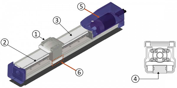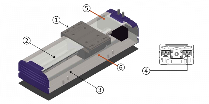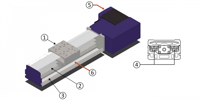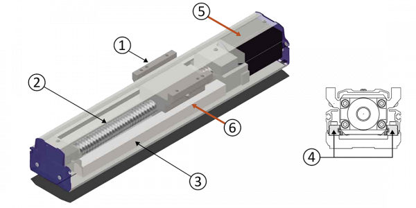 Exempel för modell RSF4 med tvärsnittsskiss: (1) vagn, (2) kulskruvsdrivning, (3) och (4) styrskenor, (5) exempel med AC-servomotor (positionssensor: roterande kodare), (6) dubbel gränsbrytare, 4-punkts rund bågbana guide.